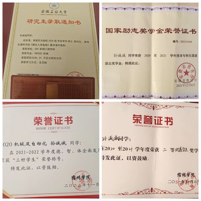 孙诚诚,2020年9月至2023年7月就读于我院机械制造及自动化专业,表现优秀,担任班级学习委员,学习成绩优异,先后获得国家励志奖学金,校级一等、二等奖学金。2023年通过专升本考试考入安徽工业大学机械制造及其自动化专业,在校期间获得校级一等、二等奖学金。2025年,通过全国研究生考试考取安徽工业大学机械专业硕士研究生。
