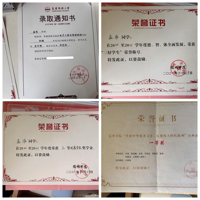 孟伟,2020年9月至2023年7月就读于我院机械制造及自动化专业,在校期间表现优秀,担任班级组织委员,曾获得奖学金和三好学生称号,学习之余积极参加校园文体活动,多次获得奖项,得到师生的一致好评。2023年通过专升本考试顺利考入安徽工业大学机械制造及其自动化专业,担任班级学习委员,获得校级三等奖学金。2025年通过全国研究生考试考入安庆师范大学机械专业硕士研究生。