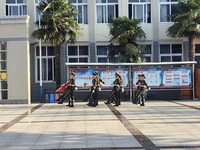上午7:30,国旗护卫队员迈着铿锵步伐走向升旗台,在《义勇军进行曲》奏响时,五星红旗迎着朝阳冉冉升起,全体师生庄严肃立、行注目礼,现场氛围肃穆庄重。