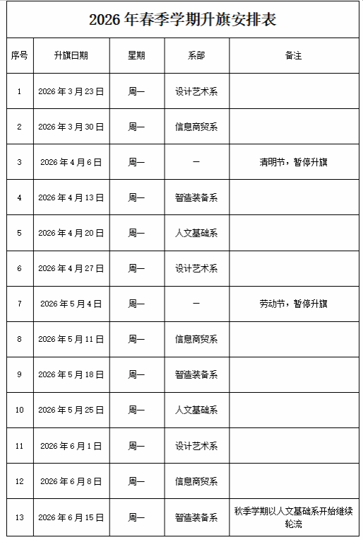 为进一步贯彻落实《新时代爱国主义教育实施纲要》,大力弘扬爱国主义精神,增强全体师生的国家观念和民族自豪感,凝聚奋进力量,营造庄严隆重、积极向上的校园文化氛围,经研究决定,现将2026年春季学期升国旗活动有关事项通知如下: