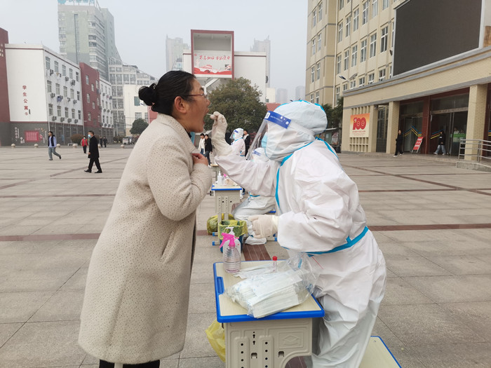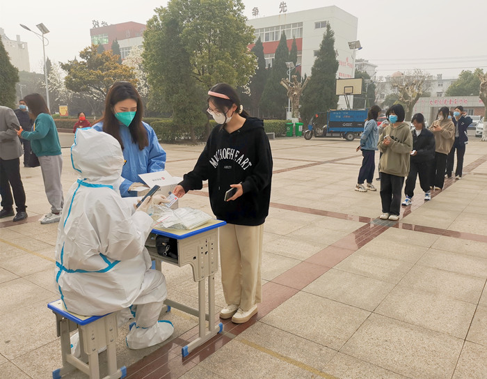 3月14日上午,学校在升旗广场开展全员核酸检测。检测对象包括学校全体师生员工及第三方服务人员。校领导王绍卫等到现场指导工作。师生员工佩戴口罩,间隔一米线,分批分时间段抵达升旗广场排队候检。在扫码完成信息登记后,由医务人员进行咽拭子采样,检测完的师生员工自觉迅速离场,核酸检测现场规范有序。