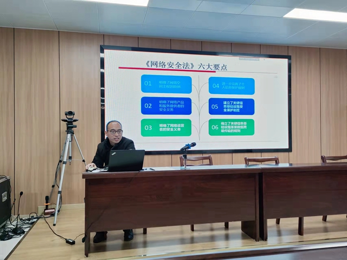 学院网络与信息中心尉俊飞老师做网络安全专题讲座。首先带领大家学习习近平总书记关于总体国家安全观的重要论述,并分享自己的学习心得;其次介绍我国网信事业发展历史和《网络安全法》的制定背景、出台过程,并就重要条目做详细讲解;最后对等级保护相关知识和学院网络安全等级保护相关工作做说明。