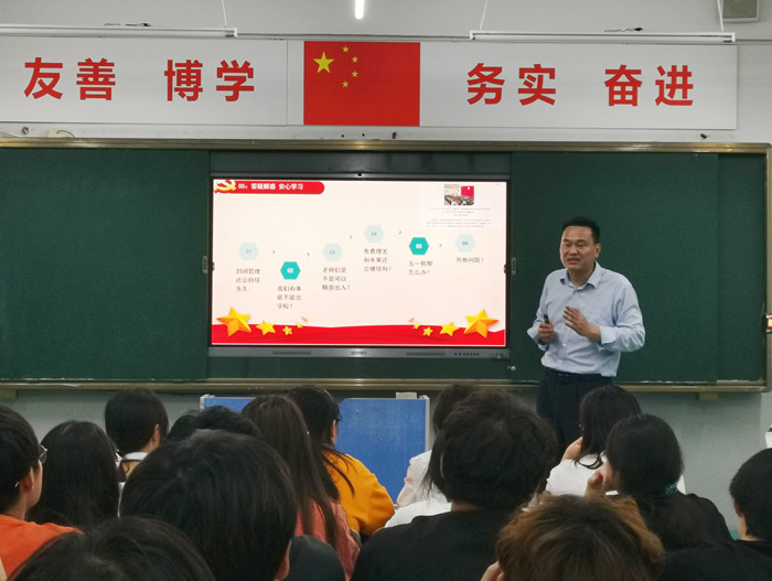 王绍卫在班会现场与学生进行了亲切交流与互动,解答了校园封闭管理、师生进出校园规定、五一放假、食堂就餐等同学们关心的问题。王绍卫深入浅出、生动形象的讲解调动了同学们听课的积极性,幽默而又饱含关爱的话语赢得了同学们热烈的掌声。班会课最后,王绍卫带领同学们学习了习近平总书记在中国人民大学考察时的重要讲话,勉励大家牢记习近平总书记嘱托,“不负时代,不负人民,在青春的赛道上奋力奔跑,争取跑出当代青年的最好成绩”。
